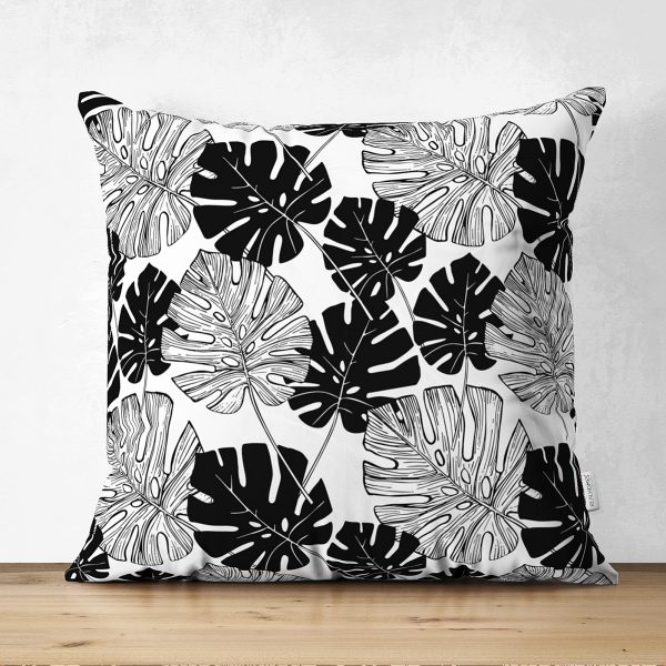 Siyah Ve Beyaz Yaprak Motifli Çift Taraflı Dekoratif Süet Yastık Kılıfı