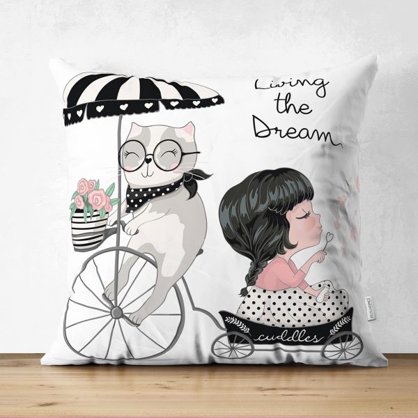 Çiçek Çerçeveli Kedi Motifli Modern Çift Taraflı Süet Yastık Kırlent Kılıfı