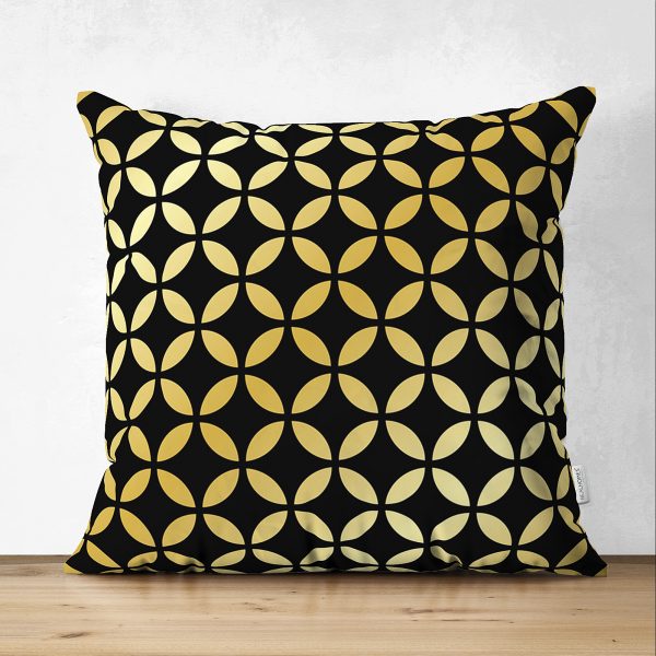 Siyah Zeminde Gold Geometrik Desenli Çift Taraflı Dekoratif Süet Yastık Kırlent Kılıfı