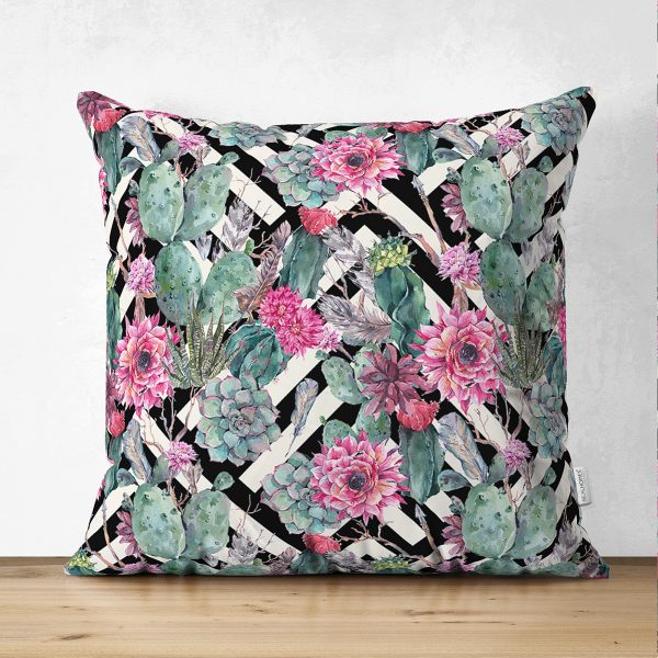 Çift Taraflı Geometrik Zeminde Çiçek ve Kaktüsler Özel Tasarım Süet Yastık Kırlent Kılıfı