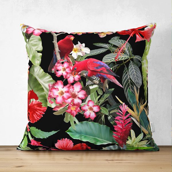 Çift Taraflı Siyah Zeminde 3D Tropikal Papağanlar Modern Süet Yastık Kırlent Kılıfı