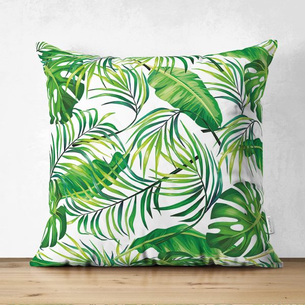 Çift Taraflı Beyaz Zeminde Yeşil Yapraklar Tasarımlı Modern Süet Yastık Kırlent Kılıfı
