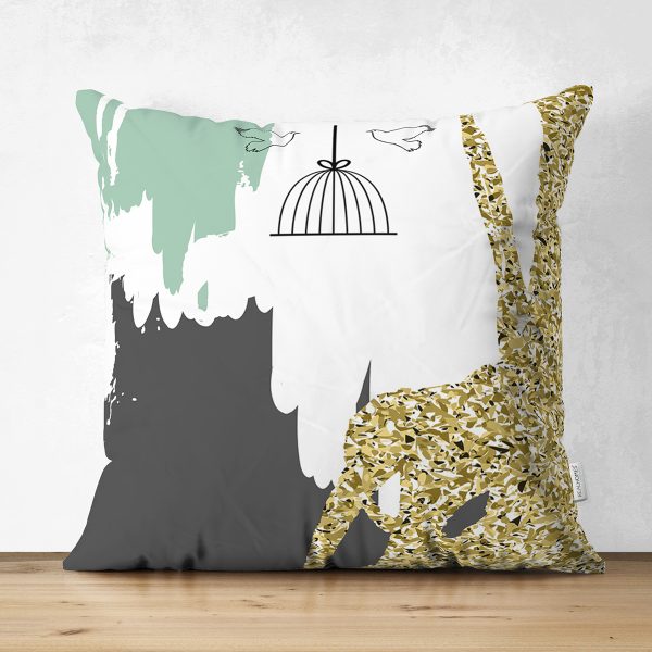Çift Taraflı Kafes Ve Kuş Motifli Gold Modern Motifler Süet Yastık Kırlent Kılıfı