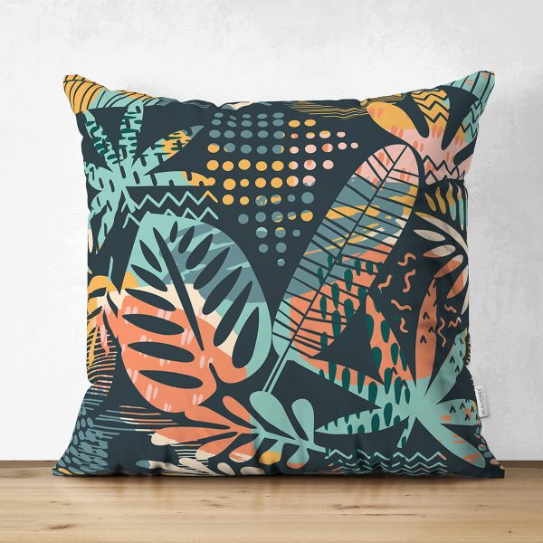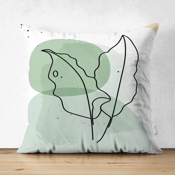 Çift Taraflı Pastel Renkli Zemin Üzerine Onedraw Yaprak Çizimli Modern Süet Kırlent Kılıfı