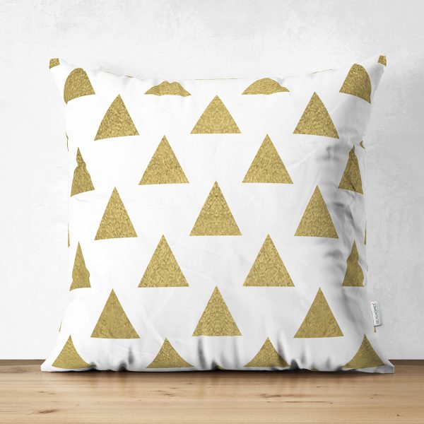 Çift Taraflı Beyaz Zeminde Gold Ucgen Detaylı Dijital Baskılı Modern Süet Yastık Kırlent Kılıfı