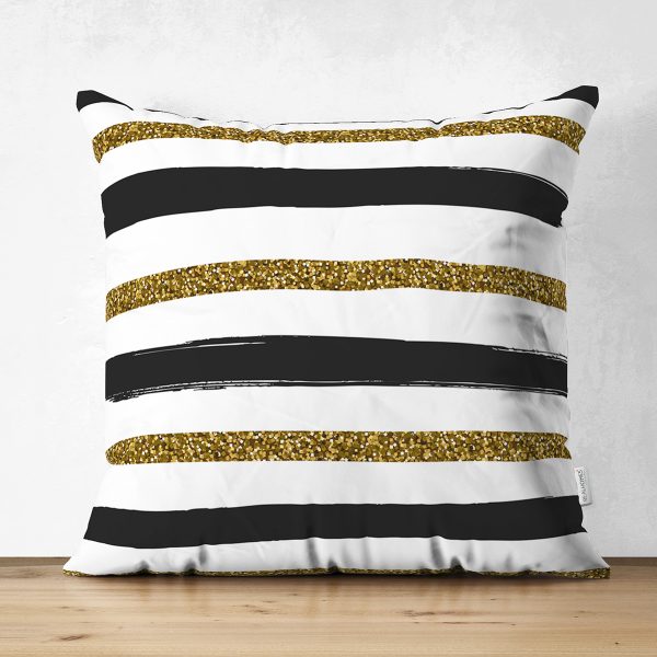 Çift Taraflı Beyaz Zemin Üzerinde Gold Ve Siyah Renkli Çizgiler Modern Süet Yastık Kırlent Kılıfı
