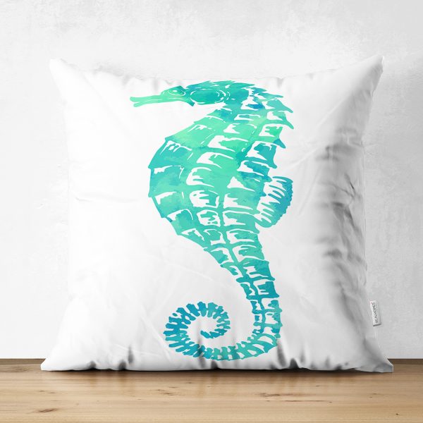 Çift Taraflı Beyaz Zeminde Yeşil Renkli Deniz Atı Desenli Dijital Baskılı Modern Süet Kırlent Kılıfı