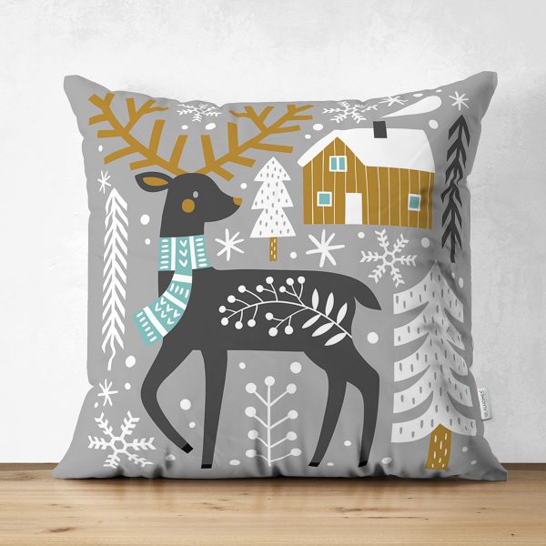 Çift Taraflı Gri Zeminde Geyik Desenli Dijital Baskılı Modern Süet Yastık Kırlent Kılıfı