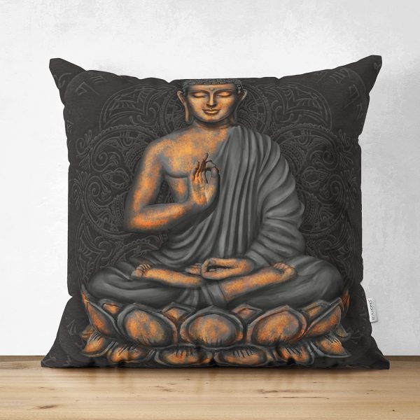 Gri Zeminde Buda Heykeli Motifli Çift Taraflı Özel Tasarım Süet Kırlent Kılıfı