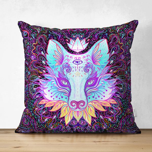 Renkli Zeminde Kurt Motifli Çift Taraflı Dekoratif Süet Kırlent Kılıfı