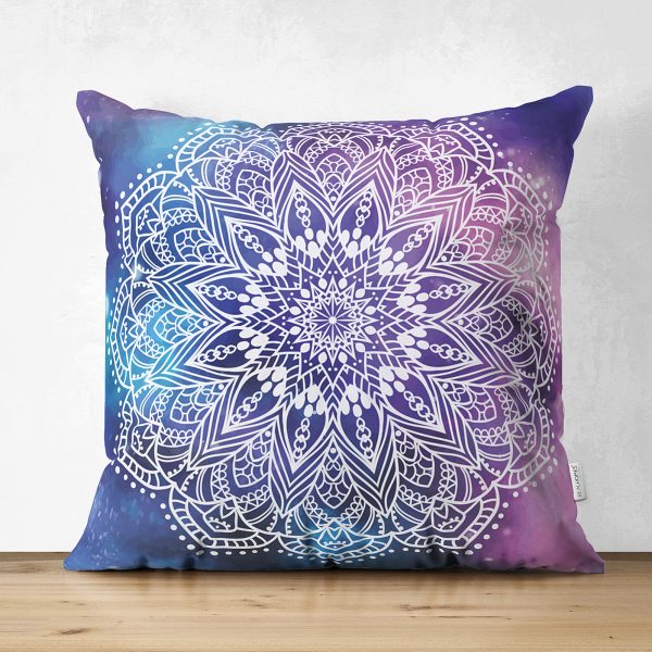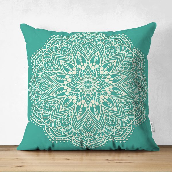 Turkuaz Zeminde Mandala Çift Taraflı Dijital Baskılı Modern Süet Kırlent Kılıfı