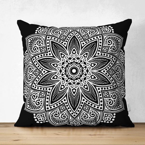 Siyah Beyaz Mandala Tasarımlı Çift Taraflı Dekoratif Süet Kırlent Kılıfı