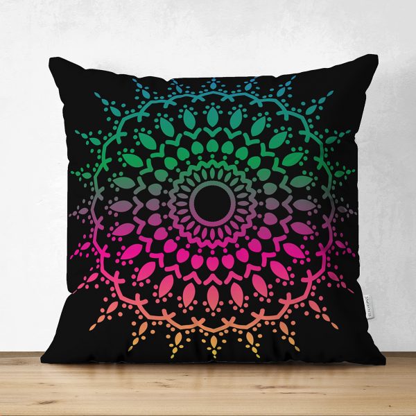 Çift Taraflı Siyah Zeminde Pembe Yeşil Mandala Motifli Süet Kırlent Kılıfı