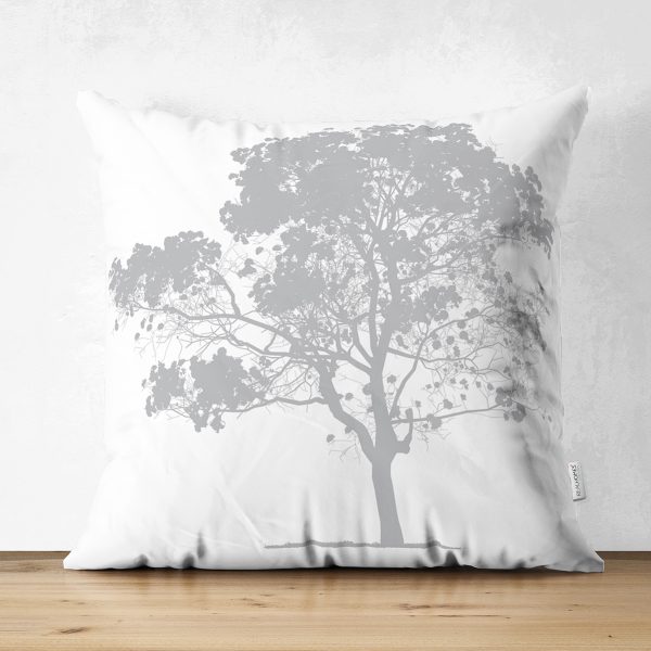 Çift Taraflı Dekoratif Beyaz Zemimde Gri Ağaç Desenli Süet Kırlent Kılıfı