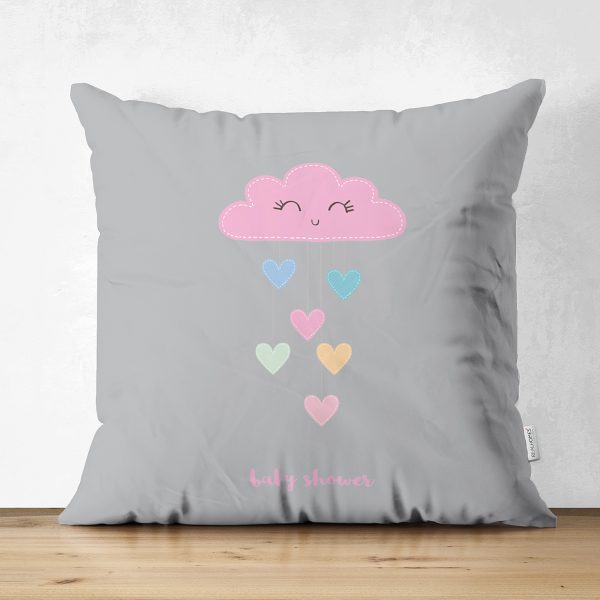 Çift Taraflı Gri Zeminde Pembe Bulutlu Baby Shower Çocuk Odası Süet Yastık Kırlent Kılıfı