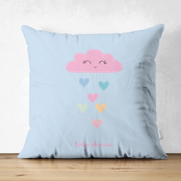 Çift Taraflı Mavi Zeminde Pembe Bulutlu Baby Shower Çocuk Odası Süet Yastık Kırlent Kılıfı