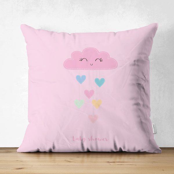 Çift Taraflı Pembe Zeminde Pembe Bulutlu Baby Shower Çocuk Odası Süet Yastık Kırlent Kılıfı
