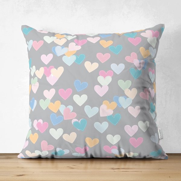 Çift Taraflı Gri Zeminde Rengarenk Kalpler Çocuk Odası Süet Yastık Kırlent Kılıfı