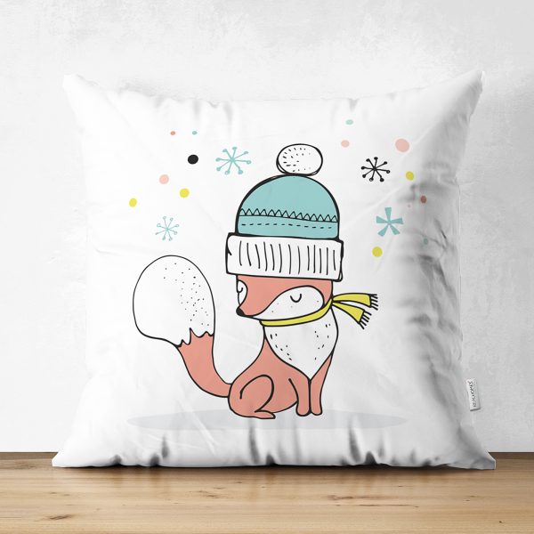 Çift Taraflı Beyaz Zeminde Sevimli Tilki Desenli Bebek Odası Süet Yastık Kırlent Kılıfı