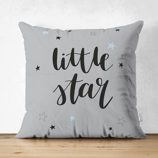 Çift Taraflı Gri Zeminde Little Star Yıldız Tasarımlı Bebek Odası Süet Yastık Kırlent Kılıfı