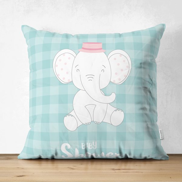 Çift Taraflı Yeşil Ekose Zeminli Fil Desenli Bebek Odası Süet Yastık Kırlent Kılıfı