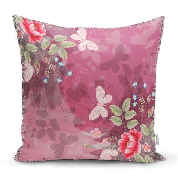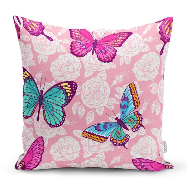 Realhomes Pembe Zeminde Kelebek Desenli Dijital Baskılı Modern Yastık Kırlent Kılıfı