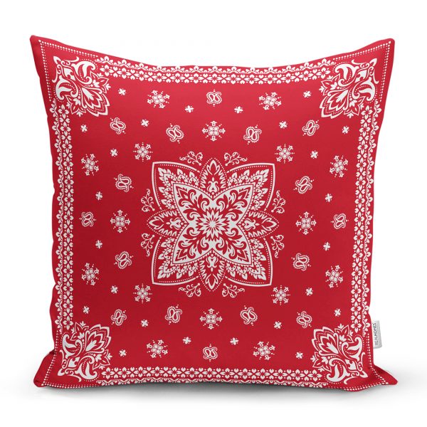 Realhomes Kırmzı Zeminde Etnik Motifler Dijital Baskılı Modern Yastık Kırlent Kılıfı
