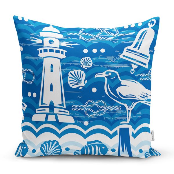 Mavi Beyaz Zeminli Yelken Desenli Dijital Baskılı Modern Yastık Kırlent Kılıfı