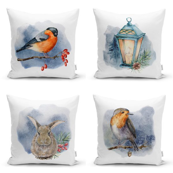 4’lü Beyaz Zemin Suluboya Üzerinde Hayvan Tasarımlı Dijital Baskılı Modern Kırlent Kılıfı Seti