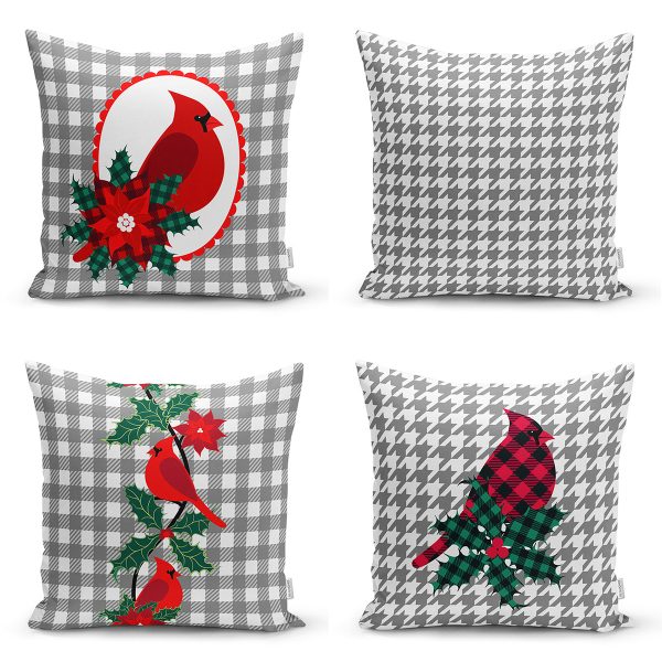 4’lü Gri Ekose Zeminli Kuş Tasarımlı Dijital Baskılı Modern Kırlent Kılıfı Seti