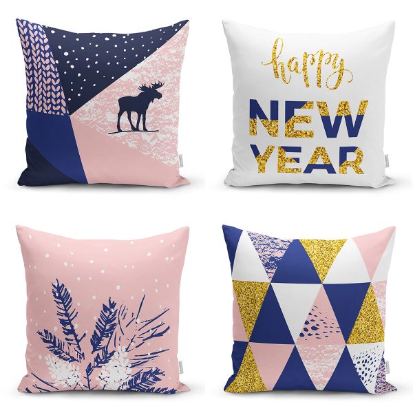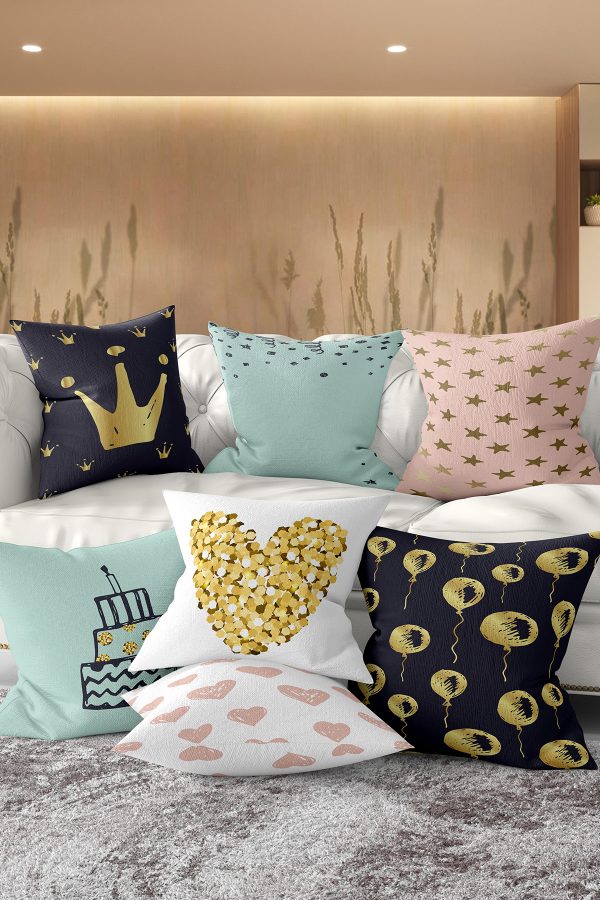 7’li Renkli Geometrik Çizimli Gold Detaylı Dijital Baskılı Kırlent Kılıfı Seti