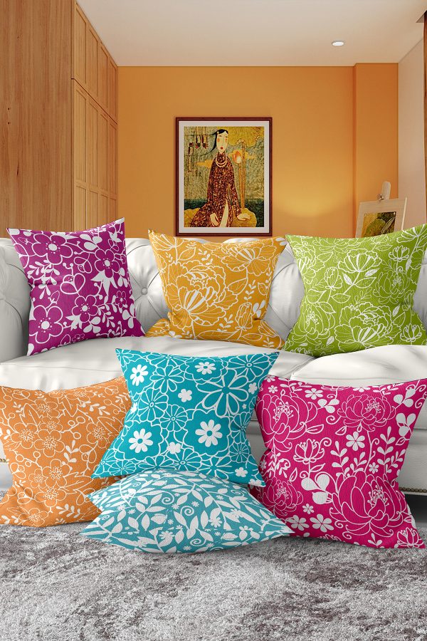 7’li Rengarenk Zemin Çiçek Motifli Dijital Baskılı Kırlent Kılıfı Seti