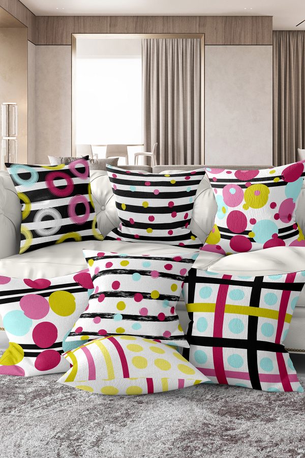7’li Renkli Çizgili Puan Tasarımlı Dijital Baskılı Kırlent Kılıfı Seti
