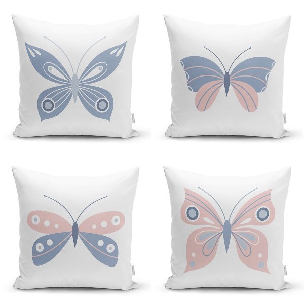 4’lü Beyaz Zemin Pembe & Mavi Kelebek Tasarımlı Dijital Baskılı Modern Kırlent Kılıfı Seti
