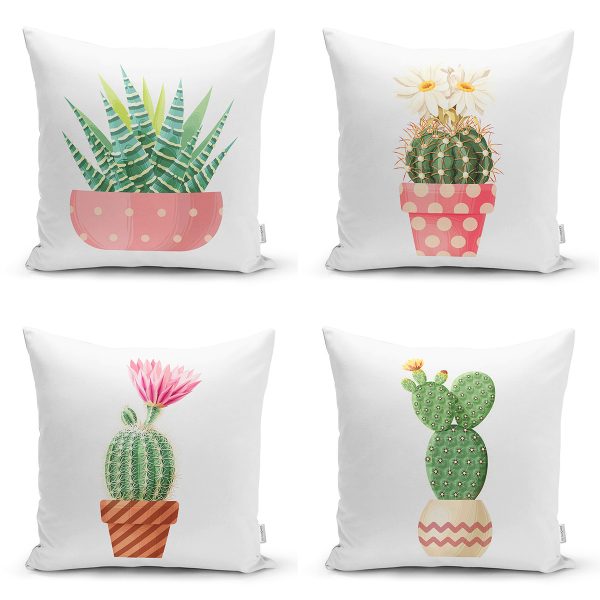 4’lü Sevimli Saksılı Kaktüs Tasarımlı Dijital Baskılı Modern Kırlent Kılıfı Seti