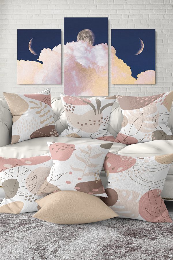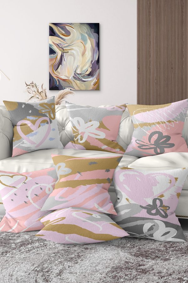 7’li Pembe Renkli Pastel Çizimli Dijital Baskılı Kırlent Kılıfı Seti