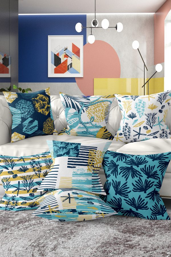 7’li Renkli Deniz Yosunu Tasarımlı Dijital Baskılı Kırlent Kılıfı Seti
