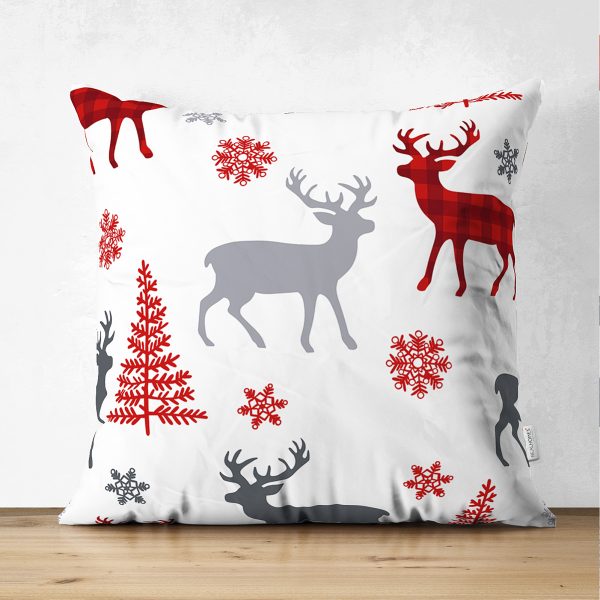 Çift Taraflı Kırmızı Geyikler ve Ağaçlar Yılbaşı Konseptli Dijital Baskılı Süet Yastık Kılıfı