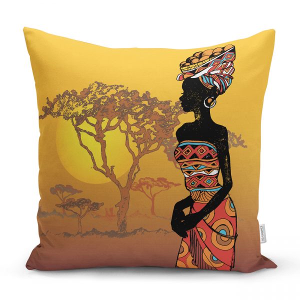 Güneşin Batışındaki Ağaç Zeminli Afrika Kadın Motifli Kırlent Kılıfı