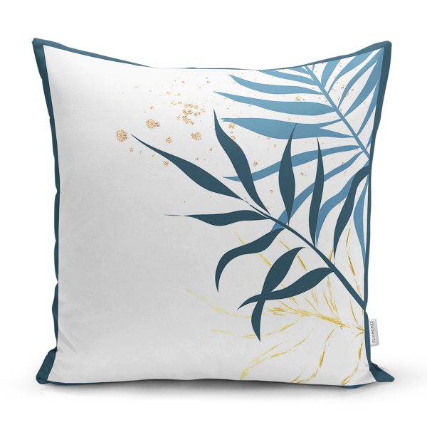 Mavi Simli Zemin Yapraklı Tasarım Desenli Dijital Baskılı Dekoratif Raşel Kadife Yastık Kırlent Kılıfı
