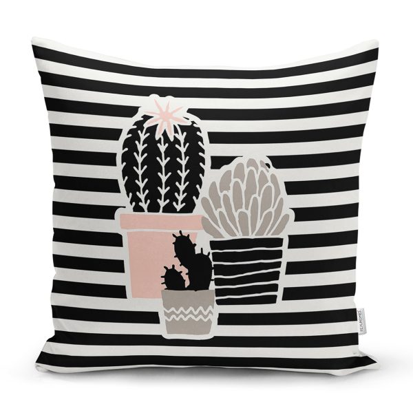 Renkli Zemin Üzerinde Siyah Çizgili Kaktüs Desenli Modern Yastık Kırlent Kılıfı