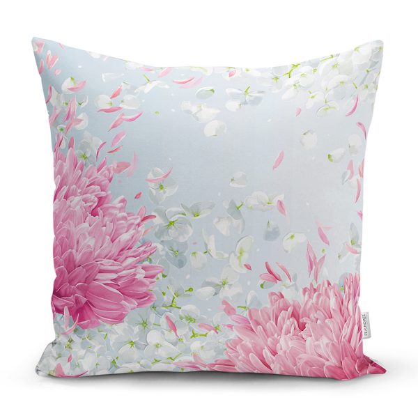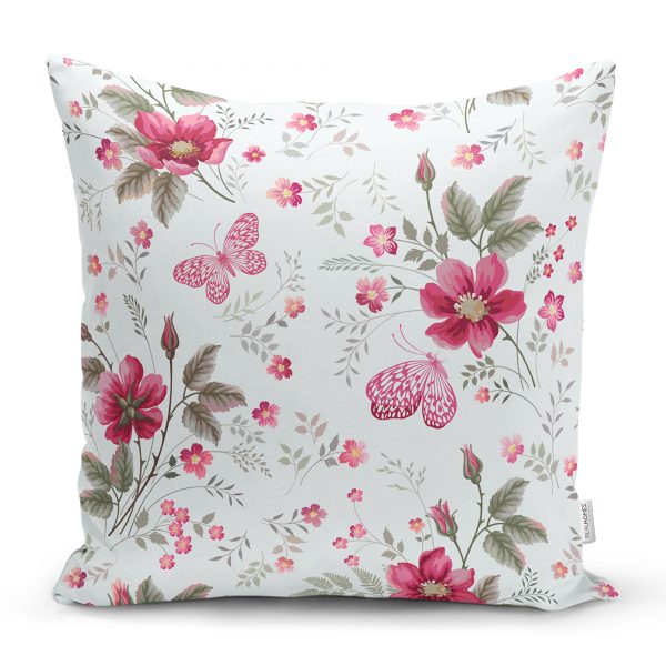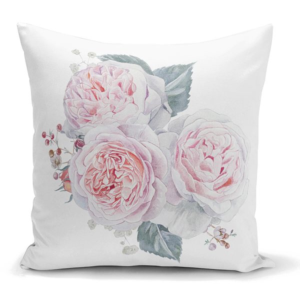 Realhomes Beyaz Zeminde Pembe Çiçekler Dijital Baskılı Modern Yastık Kırlent Kılıfı