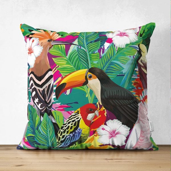 Çift Taraflı Amazon Papağan Temalı Dijital Baskılı Süet Kırlent Kılıfı