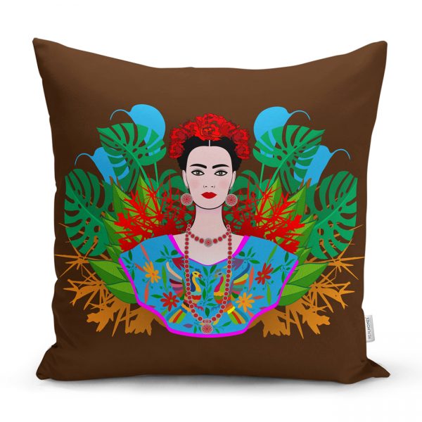 Kahverengi Zeminde Özel Tasarım Frida Kahlo Baskılı Kırlent Kılıfı