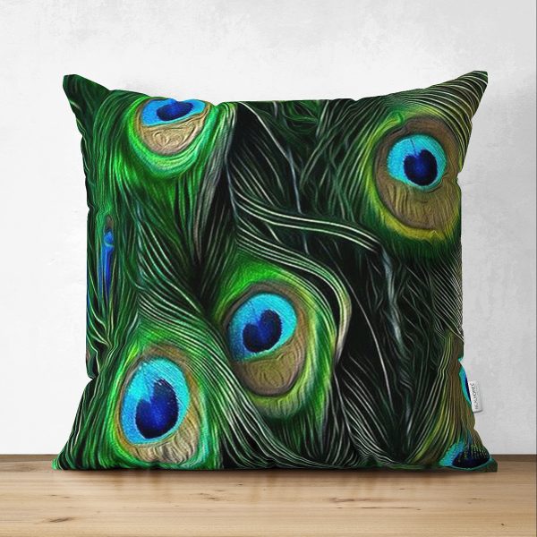 Çift Taraflı Koyu Zeminde Renkli Tüyler Özel Tasarımlı Dekoratif Süet Yastık Kırlent Kılıfı