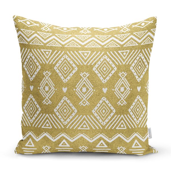 Gold Zeminde Beyaz Bohem Çizimli Dijital Baskılı Modern Yastık Kırlent Kılıfı