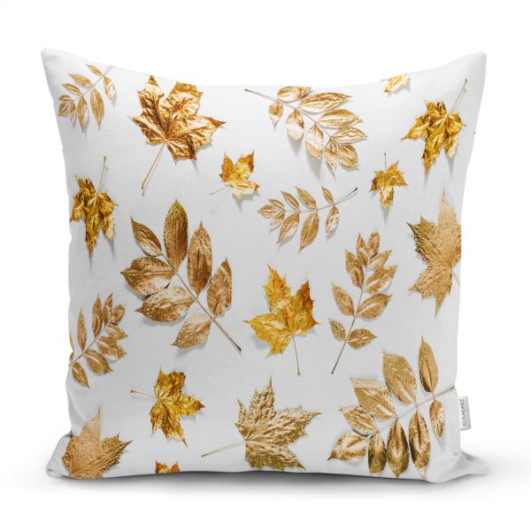 Beyaz Zeminde Altın Yapraklar Desenli Dijital Baskılı Yastık Kılıfı