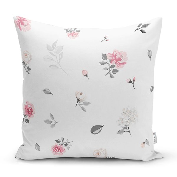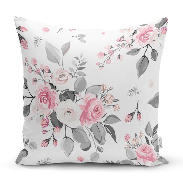 Pembe Beyaz Gül Gri Yapraklar Desenli Dijital Baskılı Modern Yastık Kırlent Kılıfı