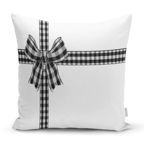 Beyaz Zemin Üzerinde Siyah Ekoseli Fiyonk Desenli Modern Yastık Kırlent Kılıfı