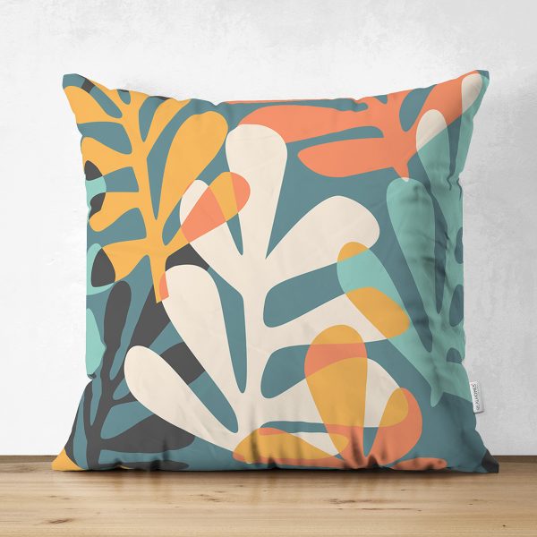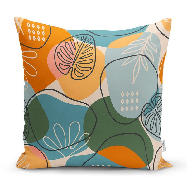 Renkli Zemin Üzerinde Onedraw Çizimli Yaprak Desenli Yastık Kırlent Kılıfı